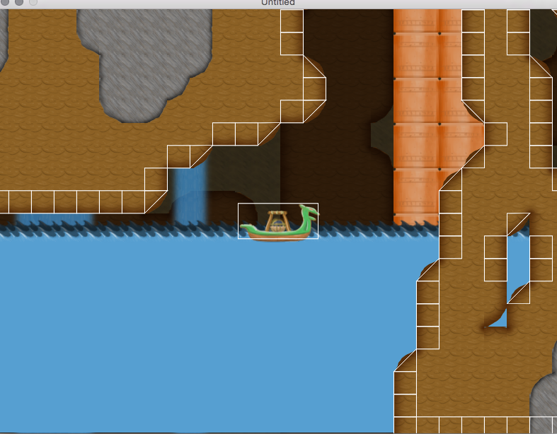 Here is a screenshot from the newest version of Vikings (which is still very much under construction). If you look at the picture you can see we’ve outlined our collide-able objects for testing. You can also see that we’ve outlined the cave walls with squares and triangles that define where the collision zones are. I was able to define these collision zones in Tiled by setting properties: