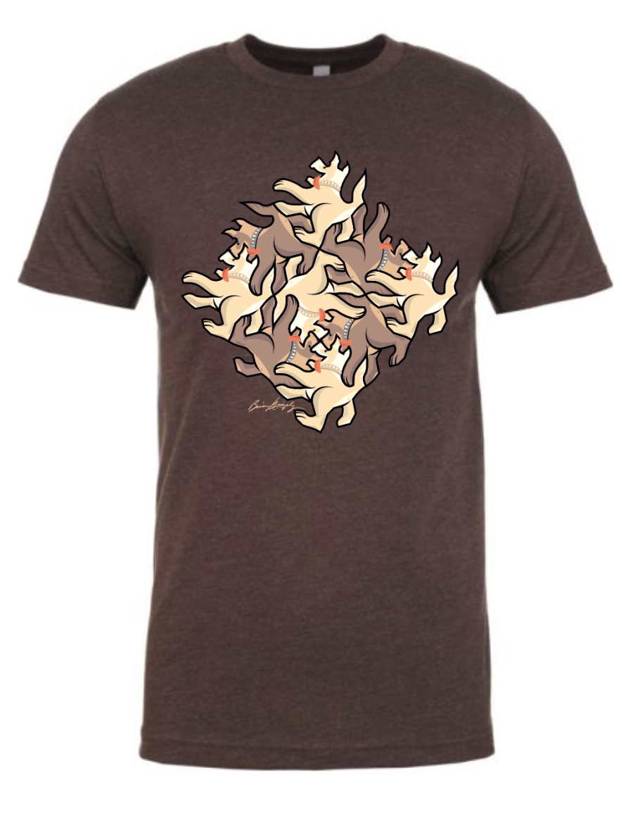 Talk about a full pack! This design ingeniously packs a multitude of dogs into a seamless, interlocking tessellation. Look closer, and you’ll appreciate the precision—every dog in this tessellation is an exact clone in shape, with only their distinct coloring setting them apart. Comfortable, clever, and undeniably unique, this tee features a visually striking graphic that’s a true conversation piece for both dog lovers and art aficionados.