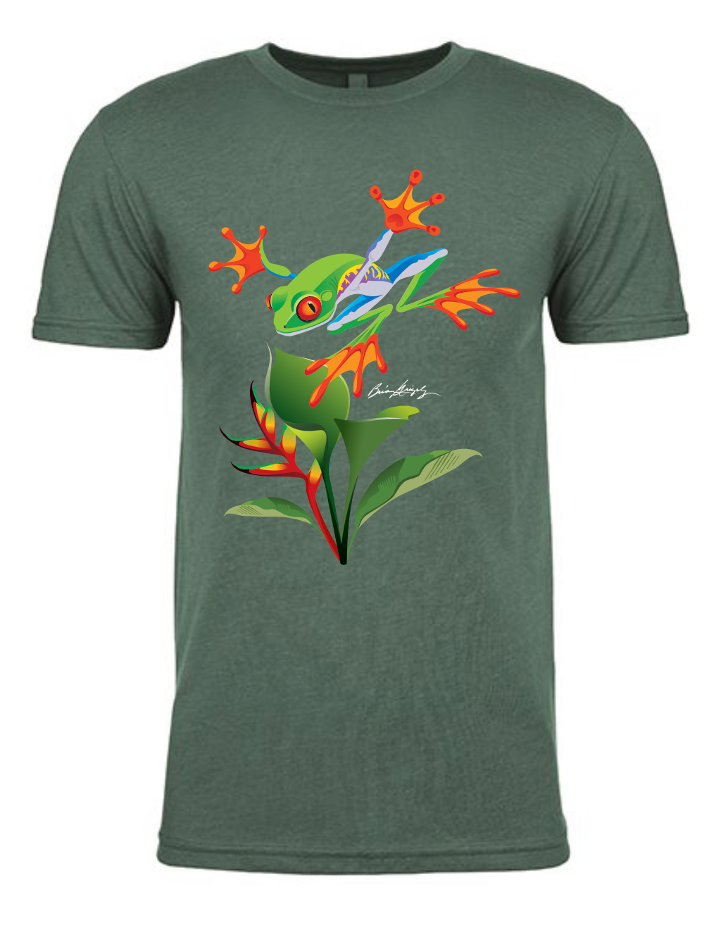 Brighten up your wardrobe with the vibrant colors of the rainforest! This tee features the stunning Red-Eyed Tree Frog, a colorful ambassador of the rainforest, in a beautifully artistic design.